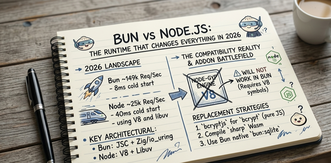 Node.js has run the server-side JavaScript world for fifteen years. It powers everything from startups to Fortune 500 backends. Then in 2023, Bun arrived — built from scratch in Zig, running on JavaScriptCore instead of V8, and shipped as a single binary that replaces your runtime, package manager, bundler, and test runner all at once. In 2026, the question isn't whether Bun is fast. It demonstrably is. The question is: when does that actually matter for you?